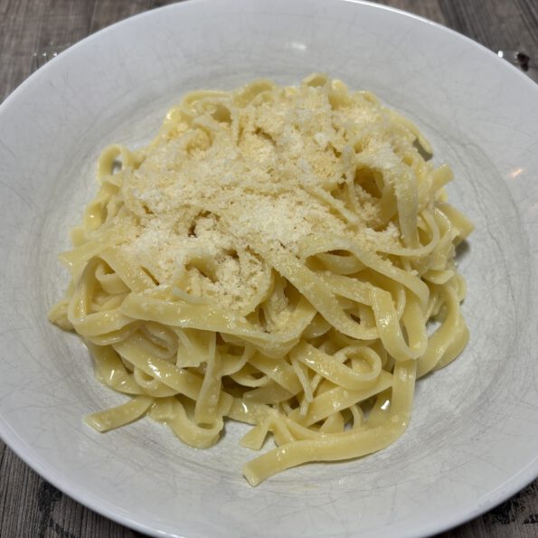 Die Butter zu den abgeschöpften Nudeln geben, umrühren und immer eine Schöpfkelle voll Nudelwasser unterrühren, bis sich eine cremige Konsistenz ergibt.